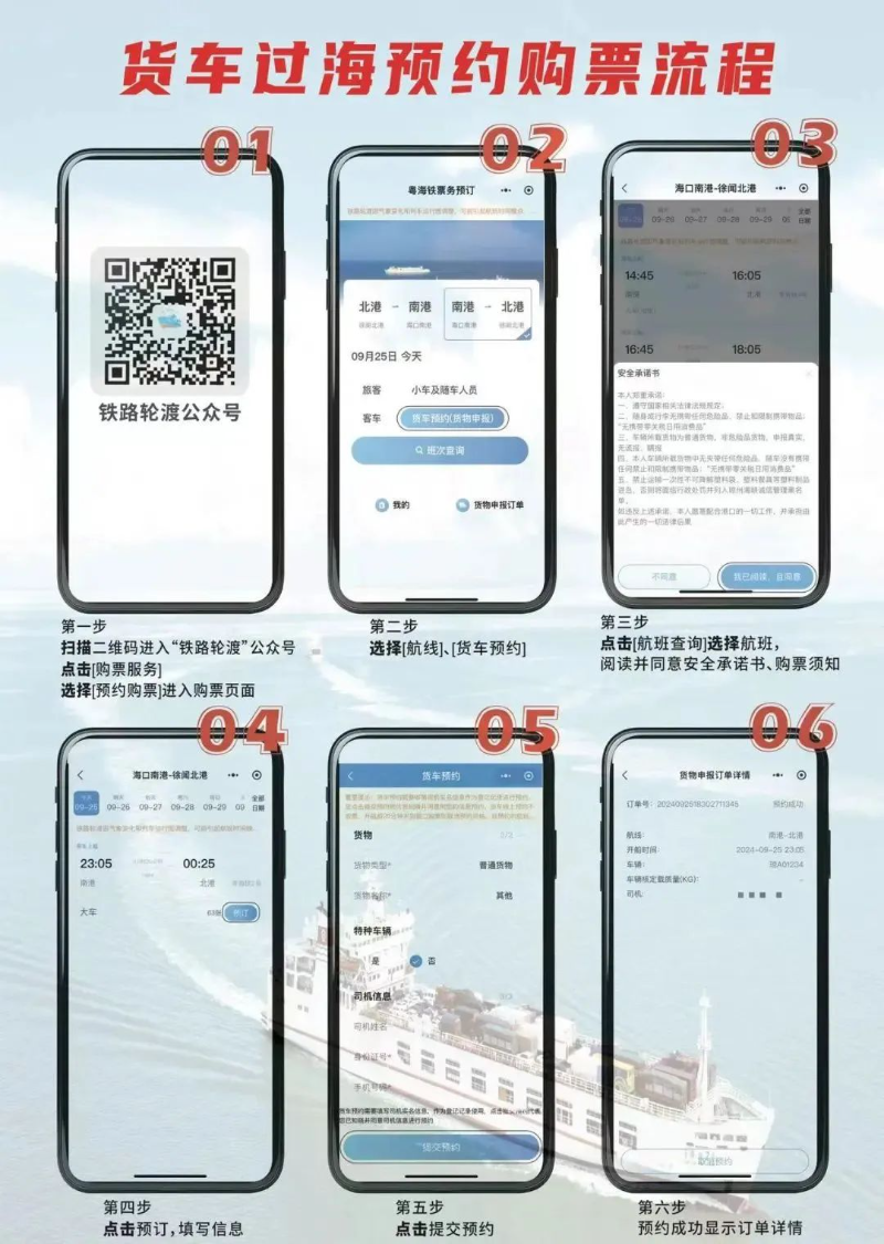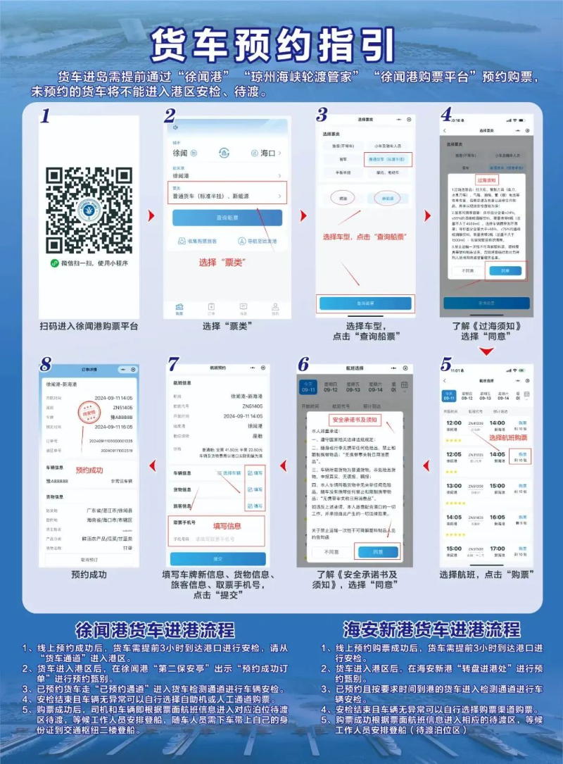 进岛货车可通过“徐闻港”“琼州海峡轮渡管家”“徐闻港购票平台”“铁路轮渡”进行预约,预约完成后根据行程安排到港购票。请司机朋友们合理安排行程,按预约航班开航前3个小时以上抵港待渡。