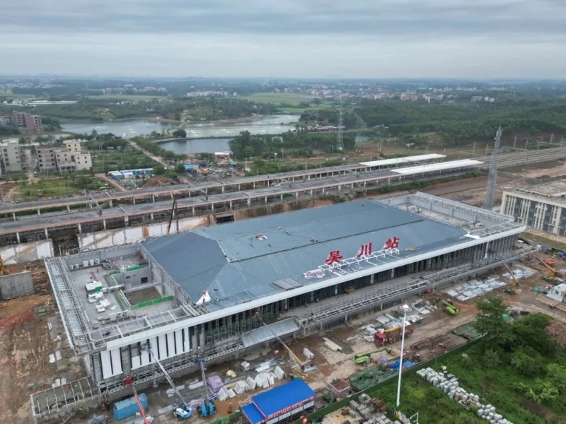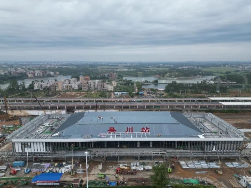 这是广湛高铁全线站房建设项目中第一个完成金属屋面铺设的高铁站,标志着吴川站建设全面进入外幕墙施工最后冲刺阶段,站房外立面即将正式亮相,为项目按期建成通车奠定了坚实基础。