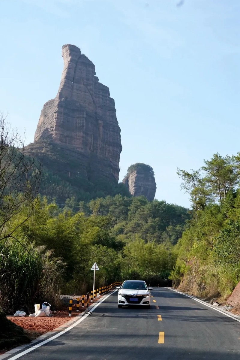 阅丹公路是实现丹霞山与韶关城区“山城融合”的重点旅游公路项目,共9条路,总长约54.6公里,将沿线的黄竹村、新桥村等十多个村庄及一帆风顺、田螺峰、巴寨景区等特色景点有效串联,既为当地群众及游客提供优质的道路出行条件,也将丹霞山美景与田园风光串珠成链,沿途山环水绕,赏心悦目。