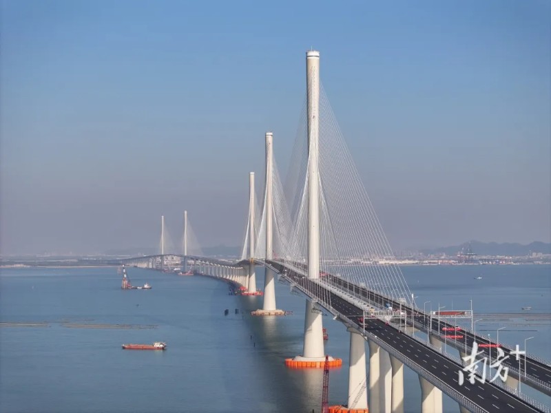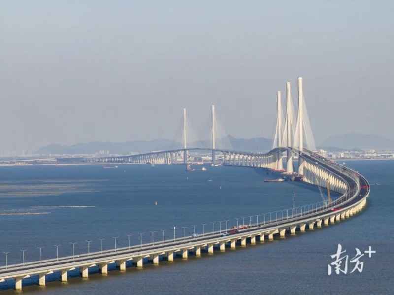 暖阳下,黄茅海海面浮光跃金,5座“小蛮腰”桥塔与通道大“C”型路线组成一道亮丽风景线,成为大湾区“新地标”。