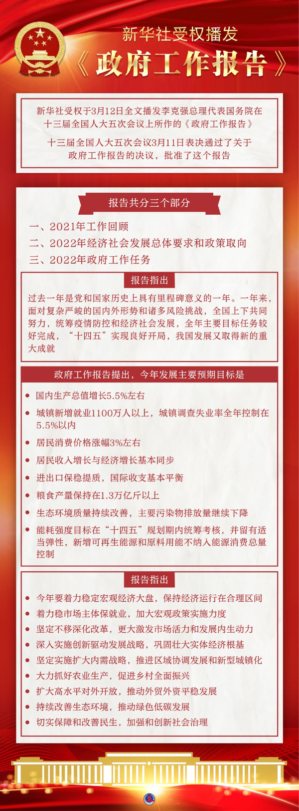 报告共分三个部分:一、2021年工作回顾;二、2022年经济社会发展总体要求和政策取向;三、2022年政府工作任务。