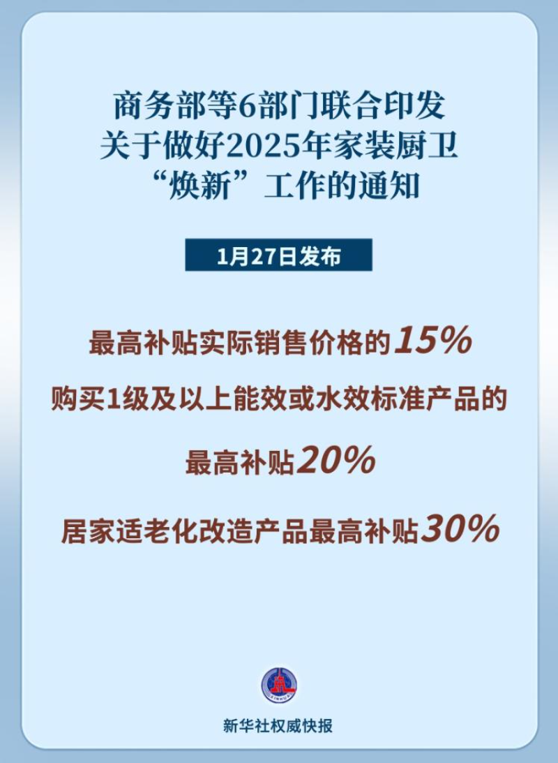 新华社北京1月27日电(记者谢希瑶、唐诗凝)商务部等6部门近日印发关于做好2025年家装厨卫“焕新”工作的通知,1月27日对外发布。