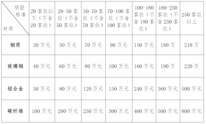 (二)新建、购买柴油动力客船补助标准按船舶新建结算发票金额的30%补助;客船柴油动力系统改造的补贴标准按实际改造结算发票金额的40%补助;以上两项补助均不得超过表一限额。