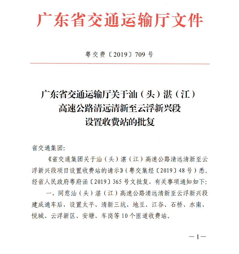 加拿大28官网 关于汕(头)湛(江)高速公路清远清新至云浮新兴段设置收费站的批复