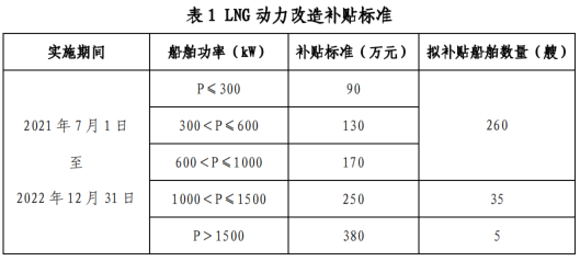 (一)改造补贴标准。根据《广东省内河航运绿色发展示范工程实施方案》,以改造后的船舶功率(指主发动机总功率,如辅发动机改造为天然气单一燃料动力,功率为主发动机和辅发动机之和)确定补贴标准:功率300kW及以下船舶,单船给予一次性补贴90万元;功率300kW-600kW(含600kW)船舶,单船给予一次性补贴130万元;功率600 kW-1000 kW(含1000 kW)船舶,单船给予一次性补贴170万元;功率1000kW-1500 kW(含1500 kW)船舶,单船给予一次性补贴250万元;功率1500kW以上船舶,单船给予一次性补贴380万元(见表1)。总补贴金额不超过5.445亿元。