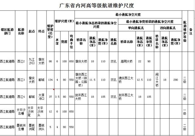广东省西江航道局内河高等级航道维护尺度公布表(2017年版)