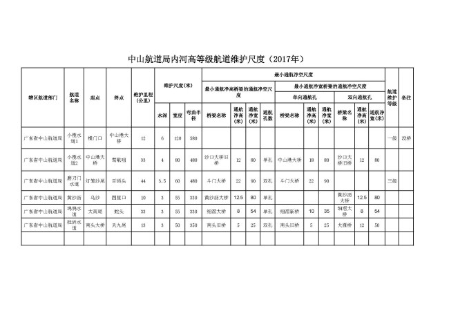中山航道局内河高等级航道维护尺度(2017年) |