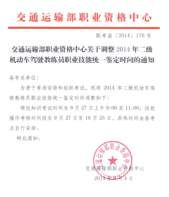 加拿大28官网 转发交通运输部职业资格中心关于开展2014年度二级机动车驾驶教练员职业技能统一鉴定有关事项的通知