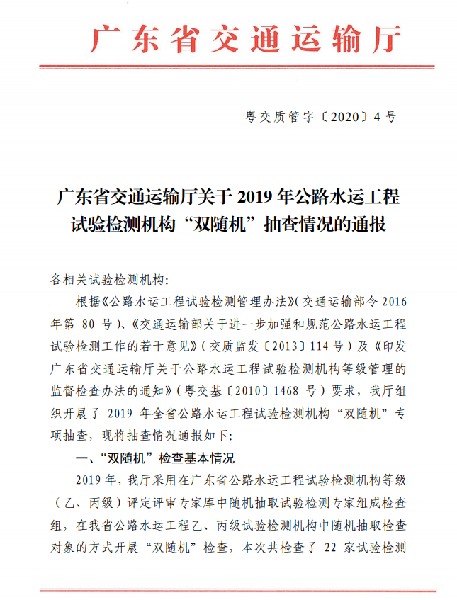 加拿大28官网 关于 2019 年公路水运工程 试验检测机构“双随机”抽查情况的通报