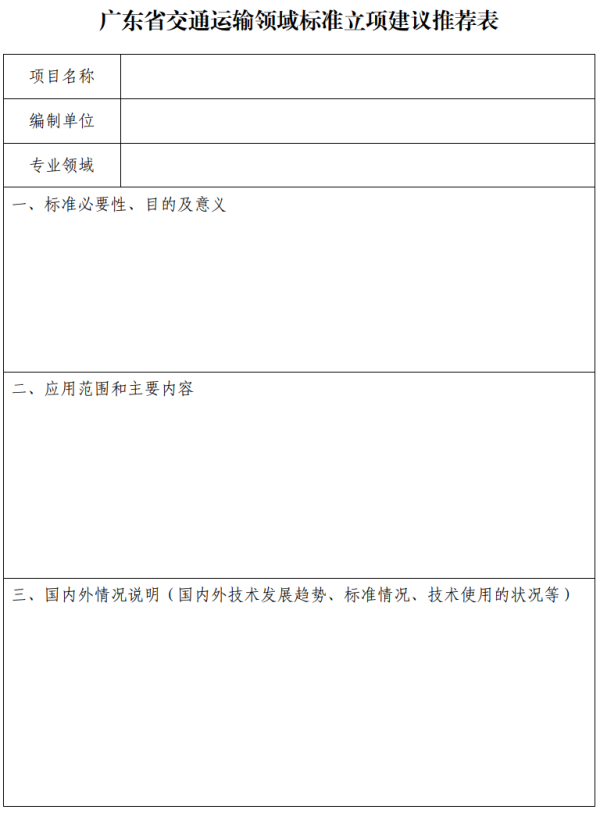 1.《广东省交通运输领域标准项目推荐表》(详见附件1),一份,含电子文档,加盖单位公章,其中专业组意见无需填写;