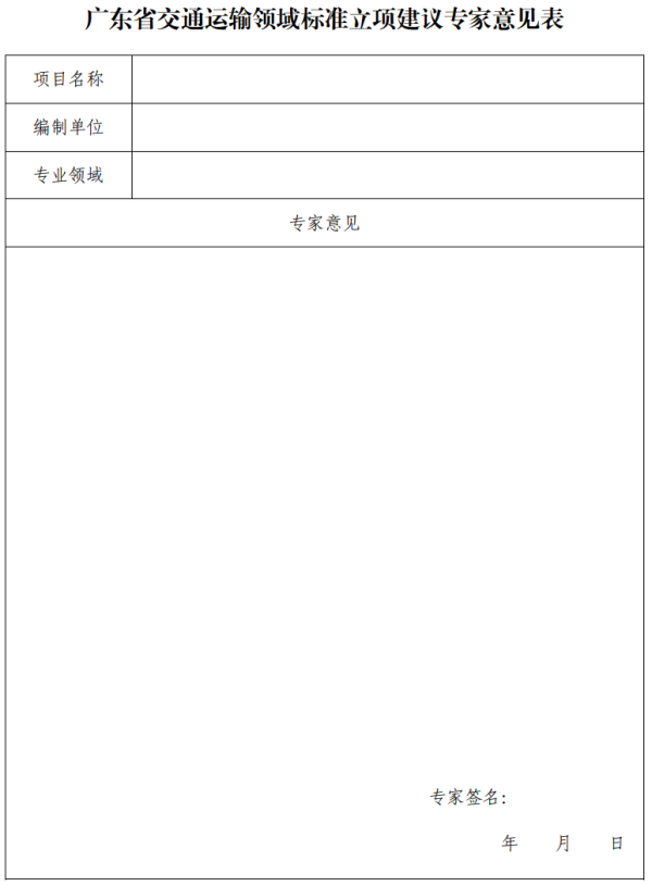 2.《广东省交通运输领域地方标准立项建议专家意见表》(详见附件2),每位专家一份,含电子文档,附专家签名扫描版;