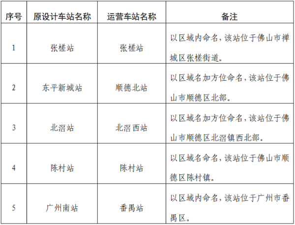 《省铁投集团关于审批广佛南环城际车站站名的请示》(粤铁投集〔2020〕552号)收悉。根据地名管理规定,经研究,我厅同意你司提出的广佛环线佛山西站至广州南段车站设站名称建议方案,具体车站名称如下: