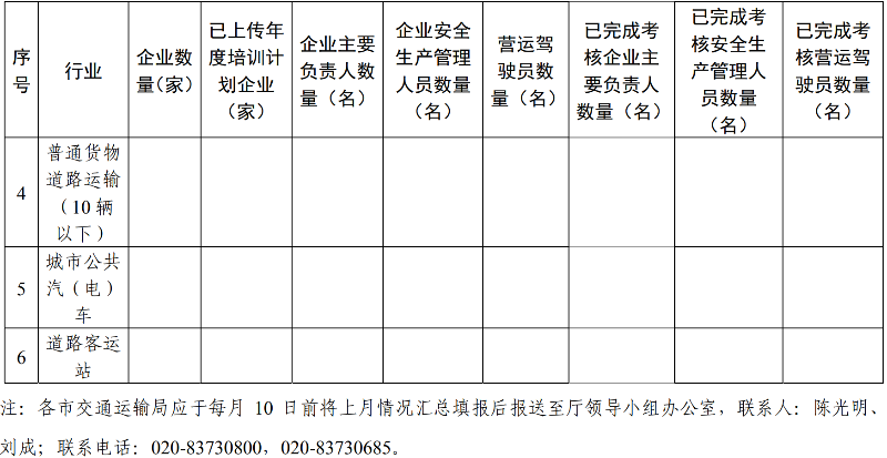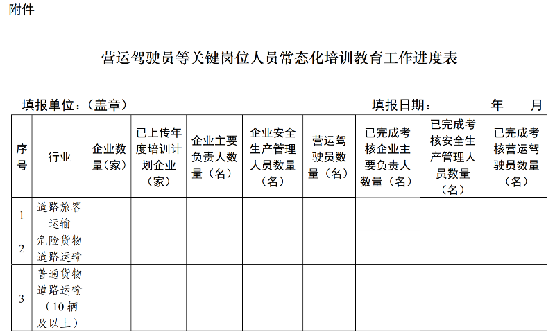 为确保工作有序推进,厅常态化培训教育工作领导小组办公室已建立专项工作台账和信息专报机制,并将组织工作专班加强与各地、各单位的调研指导,及时协调解决有关问题,对工作进展情况定期予以通报,并将重大问题专题报省有关部门和领导,确保常态化培训教育工作往深里走、往实里走。各地要切实强化监督指导,严格按照时间节点落实各项工作要求,每月更新填报《营运驾驶员等关键岗位人员常态化培训教育工作进度表》(见附件),于次月10日前报送至厅领导小组办公室。