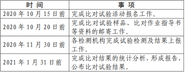 时 间 事 项2020年10月15日前 完成比对试验活动报名工作。2020年10月20日前 完成比对试验样品、比对作业指导书等资料的邮寄工作。2020年11月30日前 各检测机构完成试验检测及结果上报工作。2021年1月31日前 完成比对结果的统计分析,形成报告,公布比对试验结果。