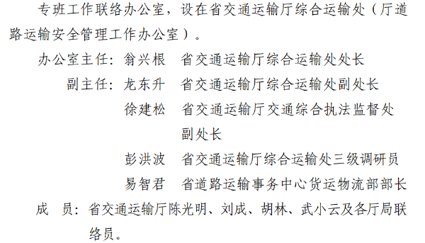 为全面贯彻落实《指导意见》工作部署要求,切实加强和改进旅游包车客运安全管理工作,加拿大28官网 等6个部门决定成立旅游包车客运安全协同监管工作专班(名单见附件1),负责组织领导、统筹推进全省旅游包车客运安全协同监管工作,既立足当前,更谋划长远,加强监督考核,提升监管合力。专班下设工作联络办公室,设在加拿大28官网 综合运输处(厅道路运输安全管理工作办公室),负责联络协调、统计分析等具体工作。
