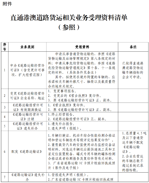 各地要按照属地管理原则,做好当地注册直通港澳道路货运企业《道路运输经营许可证》及直通港澳道路货运车辆《道路运输证》相关事项办理工作(可参照附件)。