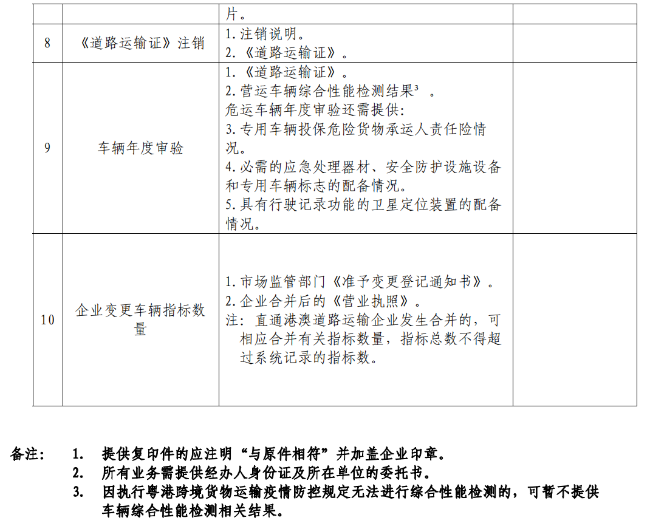 目前省有关部门正在梳理核对直通港澳道路货运企业车辆指标数量,在核对工作完成前,各地级以上市交通运输主管部门可暂按省运政系统记载的各企业直通港澳道路货运车辆指标数量及车辆信息,为相关企业办理有关审批事项。相关企业的直通港澳货车总数不得超过省运政系统记载的指标数。