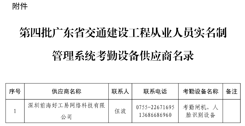 经核查,考勤设备供应商(厂家)深圳前海好工易网络科技有限公司已按要求完成其供应的考勤闸机、人脸识别设备同“实名制系统”的对接,现将其作为第四批广东省交通建设工程实名制管理系统考勤设备供应商名录(见附件,以下简称“名录”)予以发布,供使用“实名制系统”的建设项目各参建方自行选择。