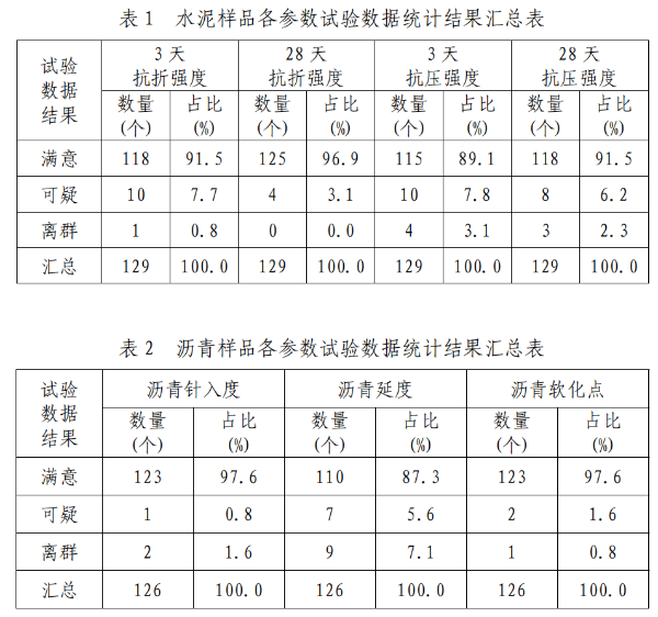 2.水泥与沥青两个项目的试验数据评价方式相同,当项目内所有参数的数据统计结果均为“满意值”时,该项目的试验数据评价结果为“满意”;当项目内所有参数出现一个及以上“可疑值”且未出现“离群值”时,该项目的数据评价结果为“基本满意”;当项目内所有参数出现一个及以上“离群值”时,该项目的数据评价结果为“不满意”。
