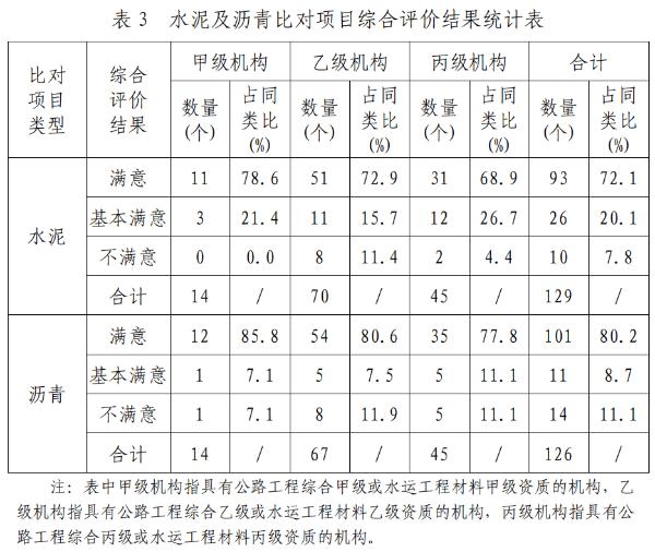 2.水泥及沥青比对项目综合评价结果按机构等级分类汇总情况见表3。