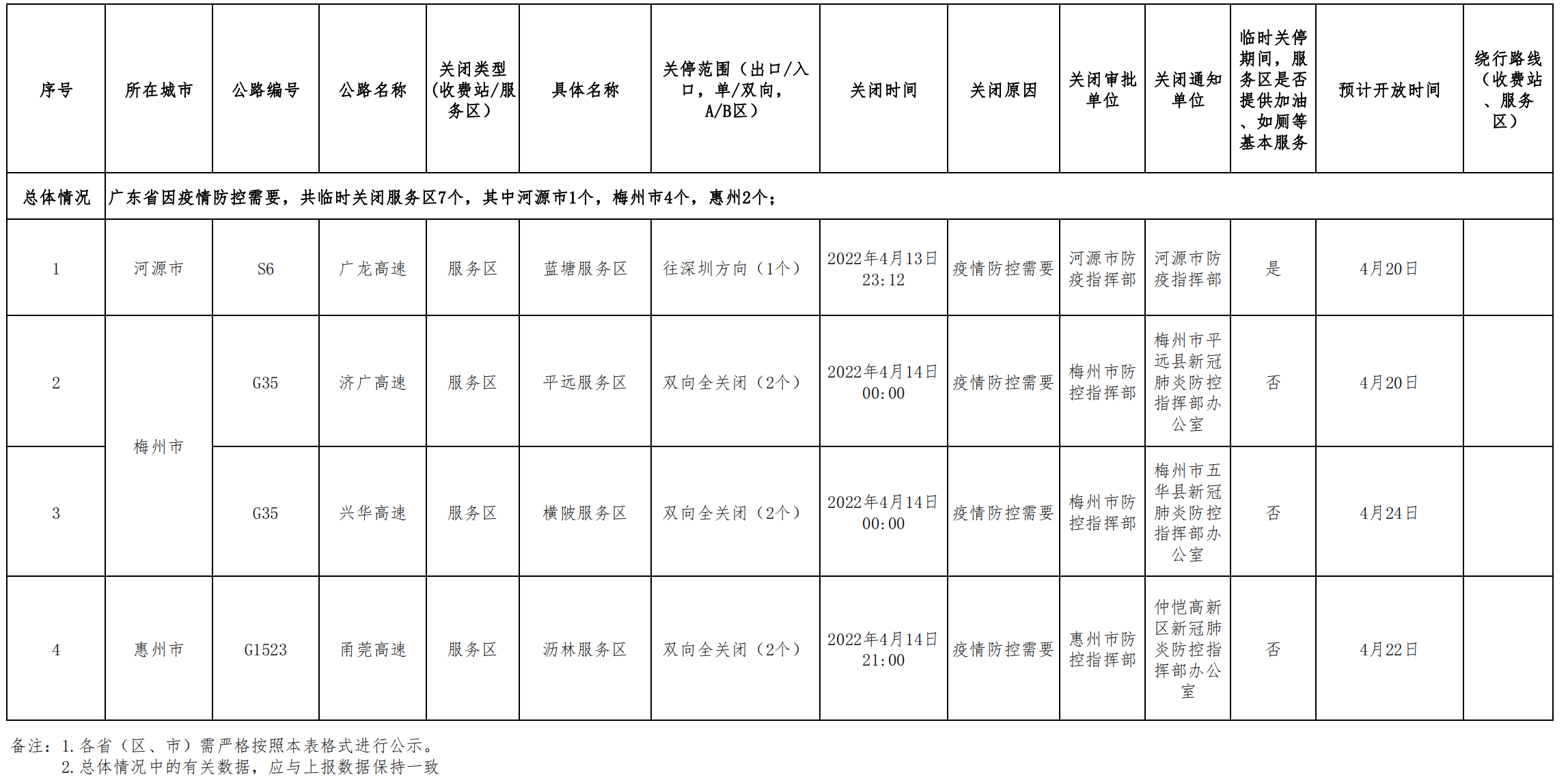 2022年4月16日广东省高速公路收费站、服务区关停情况统计表.pdf
