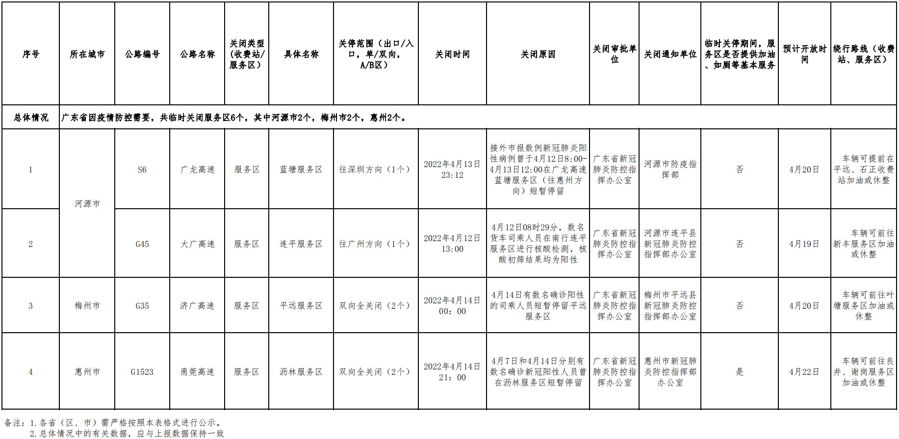 2022年4月19日广东省高速公路收费站、服务区关停情况统计表