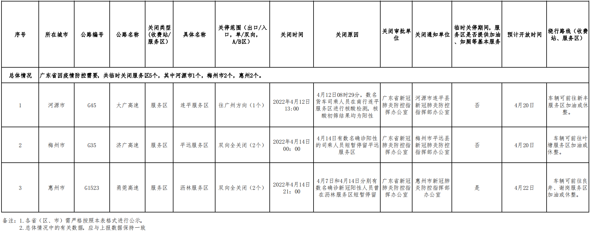 2022年4月20日广东省高速公路收费站、服务区关停情况统计表.pdf
