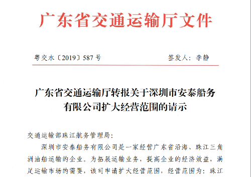 加拿大28官网 转报关于深圳市安泰船务有限公司扩大经营范围的请示