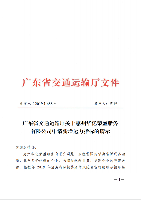 加拿大28官网 关于惠州华亿荣盛船务有限公司申请新增运力指标的请示.pdf