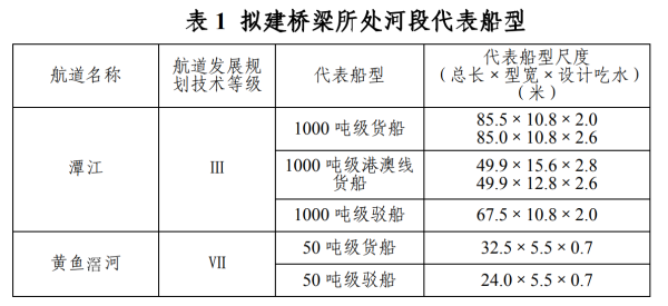 基本同意《国道G240线新会会城至牛湾段改建工程罗坑大桥航道通航条件影响评价报告》《国道G240线新会会城至牛湾段改建工程仁胜里大桥(调整方案)航道通航条件影响评价报告》(以下统称《航评报告》)论证采用桥梁所处河段的航道发展规划技术等级和代表船型,详见表1。