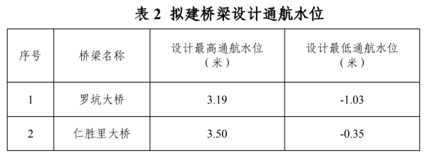 同意《航评报告》分析提出的桥梁跨越处的设计最高、最低通航水位(1985国家高程基准),详见表2。