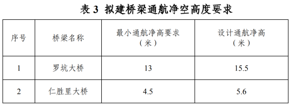 基本同意《航评报告》论证提出的拟建桥梁最小通航净高,设计方案提出的各桥梁实际通航净高均大于最小通航净高,满足通航要求,详见表3。