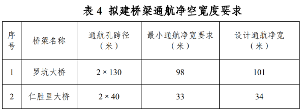 拟建桥梁均采用双孔单向通航方案,基本同意《航评报告》提出的各桥梁最小通航净宽。设计方案提出的各桥梁实际通航净宽均大于最小通航净宽,满足通航要求,详见表4。