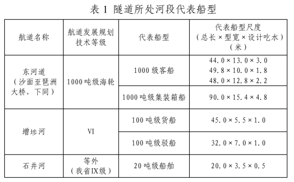 基本同意《广州市城市轨道交通八号线北延段工程过珠江(穿越东河道)隧道航道通航条件影响评价报告》《广州市城市轨道交通八号线北延段工程穿越增埗河隧道航道通航条件影响评价报告》《广州市城市轨道交通八号线北延段工程穿越石井河隧道航道通航条件影响评价报告》(以下统称《航评报告》)论证采用的隧道所处河段的航道发展规划技术等级和代表船型,详见表1。