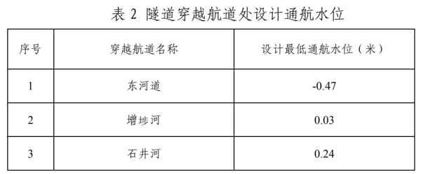 同意《航评报告》分析提出的隧道穿越航道处的设计最低通航水位(1985国家高程基准,下同),详见表2。