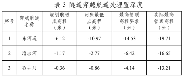 基本同意《航评报告》论证提出的隧道穿越航道处的最高管顶高程要求。隧道穿越处均埋置于河床内,在航道和可能通航的水域范围内的实际管顶高程均在最高管顶高程要求以下,满足通航要求,详见表3。