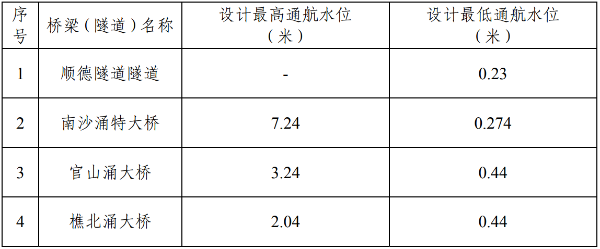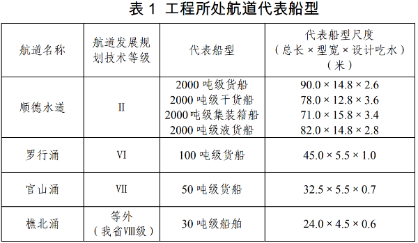 (一)代表船型基本同意《佛山市季华路西延线工程穿越顺德水道隧道航道通航条件影响评价报告》《佛山市季华路西延线工程跨越罗行涌大桥航道通航条件影响评价报告》《佛山市季华路西延线工程跨越官山涌大桥航道通航条件影响评价报告》《佛山市季华路西延线工程跨越樵北涌大桥航道通航条件影响评价报告》(以下统称《航评报告》)论证采用的工程所处河段的航道发展规划技术等级和代表船型,详见表1。