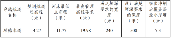 (三)隧道埋置深度基本同意《航评报告》分析论证提出的隧道穿越航道处的最高管顶高程和埋设宽度要求。设计采用盾构隧道方案(双线),隧道外径15米,出入土点均位于岸上。拟建隧道在航道和可通航水域范围内均埋置于河床内,设计顶部高程均在最高顶部高程以下,考虑各项因素影响后,仍有较大覆盖层厚度,满足通航要求,详见表3。