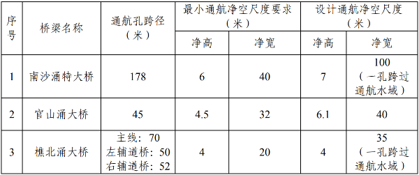 (四)桥梁通航净空尺度基本同意《航评报告》论证提出的拟建桥梁采用单孔双向通航的最小通航净空尺度要求,设计提出的桥梁实际通航净空尺度(通航净宽为垂直水流方向投影的净宽)均大于最小通航净空尺度,通航孔水中桥墩承台均埋置于河床内,满足通航要求,详见表4。