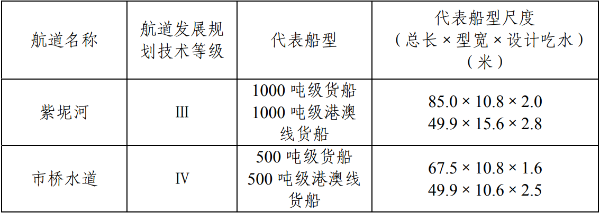 (一)代表船型基本同意《番禺区取水口优化整合工程-东部输配水管道工程穿越紫坭河航道通航条件影响评价报告》《番禺区取水口优化整合工程-东部输配水管道工程穿越市桥水道航道通航条件影响评价报告》(以下统称《航评报告》)论证提出的工程所处河段的航道发展规划技术等级和代表船型,详见表1。