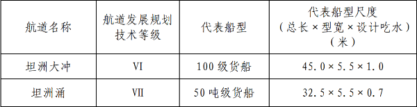 (一)代表船型基本同意《中山市坦洲大道工程航道通航条件影响评价报告》(以下简称《航评报告》)论证采用的工程所处河段的航道发展规划技术等级和代表船型,详见表1。