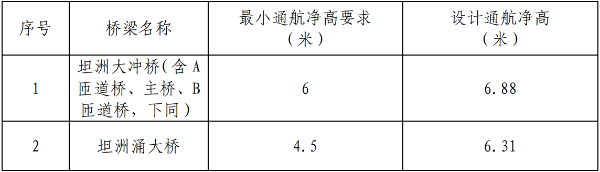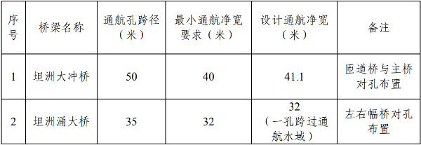 (四)通航净宽拟建桥梁均采用单孔双向通航方案,基本同意《航评报告》论证提出的各桥梁最小通航净宽。设计方案提出的各桥梁实际通航净宽均大于最小通航净宽,满足通航要求,详见表3。