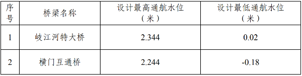(二)设计通航水位同意《航评报告》分析提出的桥梁跨越航道处的设计最高、最低通航水位(1985国家高程基准,下同),详见表2。