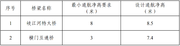 (三)通航净高基本同意《航评报告》论证提出的拟建桥梁最小通航净高,设计方案提出的各桥梁实际通航净高均大于最小通航净高,满足通航要求,详见表3。