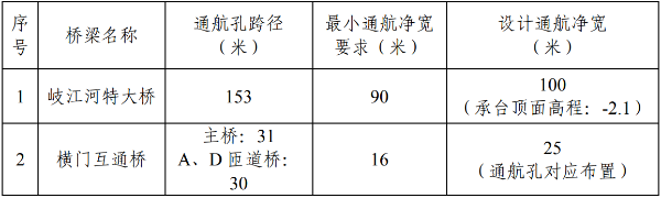 (四)通航净宽拟建桥梁均采用单孔双向通航方案,基本同意《航评报告》论证提出的各桥梁最小通航净宽。设计方案提出的各桥梁实际通航净宽均大于最小通航净宽,满足通航要求,详见表4。