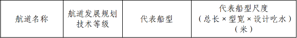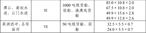 (一)代表船型基本同意《江门新会双水电厂热电联产一期600MW燃煤机组接入系统工程线路跨越潭江航道通航条件影响评价报告》《江门新会双水电厂热电联产一期600MW燃煤机组接入系统工程线路跨越南坦水道航道通航条件影响评价报告》《江门新会双水电厂热电联产一期600MW燃煤机组接入系统工程线路跨越江门水道、圣母庙河、英洲西冲航道通航条件影响评价报告》(以下统称《航评报告》)论证采用的工程所处河段航道发展规划技术等级和代表船型,详见表1。