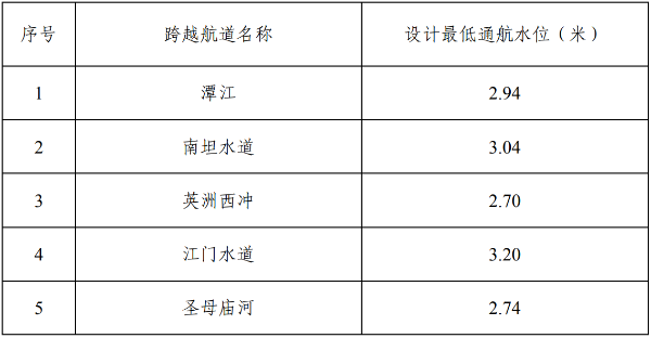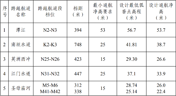 (三)通航净高基本同意《航评报告》论证提出的工程跨越航道处最小通航净高。设计方案提出的工程线路实际通航净高均大于最小通航净高,满足通航要求,详见表3。