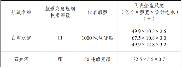 (一)代表船型基本同意《沉香大桥工程航道通航条件影响评价报告》(以下简称《航评报告》)论证采用的工程所处河段的航道发展规划技术等级和代表船型,详见表1。