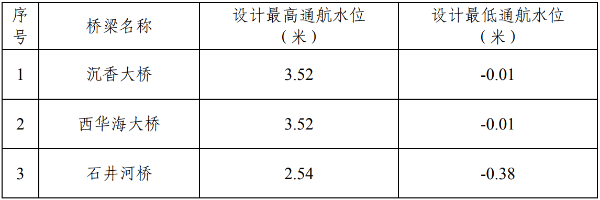 (二)设计通航水位同意《航评报告》分析提出的桥梁跨越航道处的设计最高、最低通航水位(1985国家高程基准,下同),详见表2。
