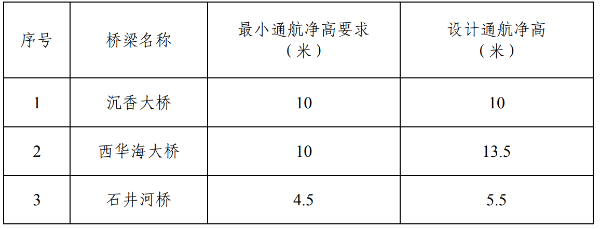 (三)通航净高同意《航评报告》论证提出的拟建桥梁最小通航净高,设计方案提出的各桥梁实际通航净高满足通航要求,详见表3。